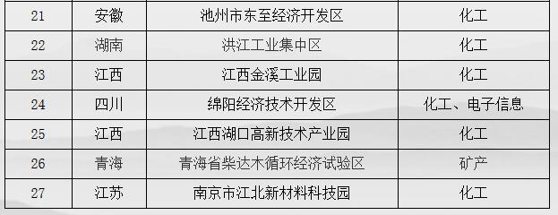 入圍的化工園區(qū)有:上海化學(xué)工業(yè)區(qū)、四川什邡經(jīng)濟(jì)開發(fā)區(qū)、安慶市高新技術(shù)產(chǎn)業(yè)開發(fā)區(qū)、姚家港化工園、宜都高新技術(shù)產(chǎn)業(yè)園、祥云財(cái)富工業(yè)園、連云港徐圩新區(qū)、江西德安工業(yè)園、泰興經(jīng)濟(jì)開發(fā)區(qū)、荊門化工循環(huán)產(chǎn)業(yè)園、江西新干工業(yè)園、貴州福泉經(jīng)濟(jì)開發(fā)區(qū)、池州市東至經(jīng)濟(jì)開發(fā)區(qū)、洪江工業(yè)集中區(qū)、江西金溪工業(yè)園、綿陽經(jīng)濟(jì)技術(shù)開發(fā)區(qū)、江西湖口高新技術(shù)產(chǎn)業(yè)園、南京市江北新材料科技園。